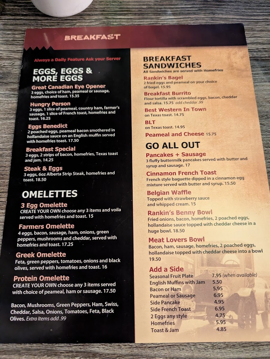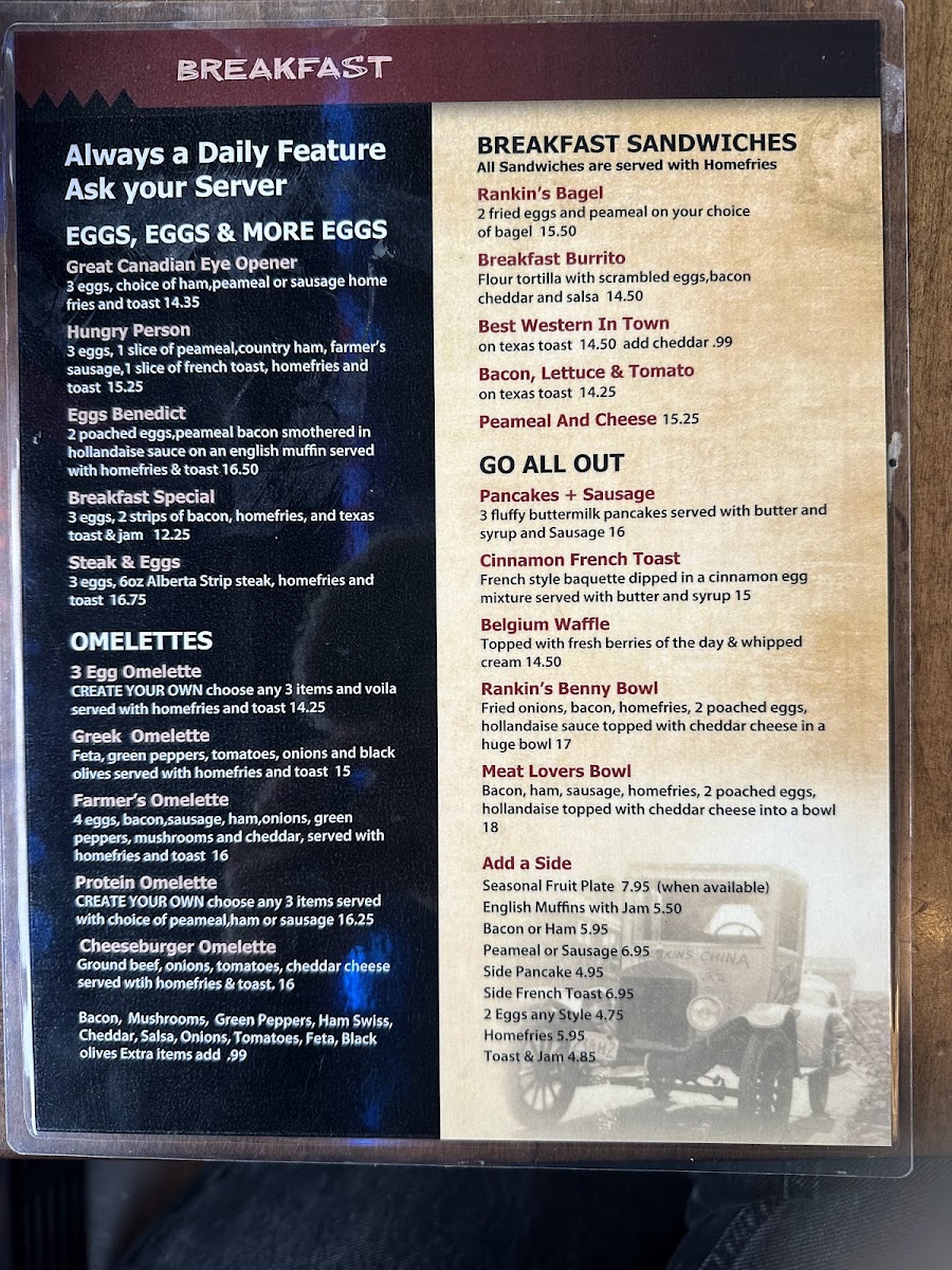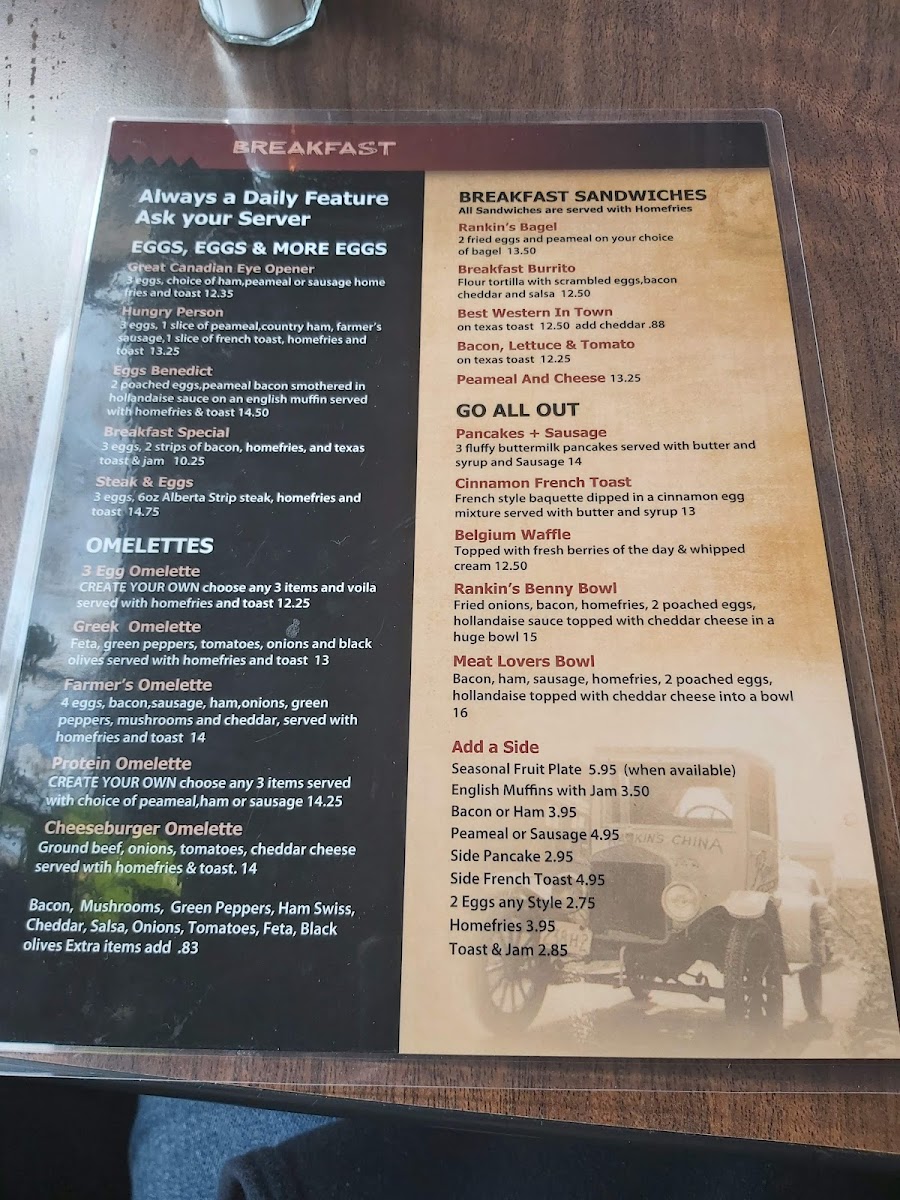 Rankin's Grill offers a hearty selection of breakfast dishes that are sure to satisfy any appetite. For those craving a classic start to their day, the "Great Canadian Eye Opener" combines eggs, bacon, sausage, and hash browns for a truly indulgent meal. If you’re feeling particularly hungry, the "Hungry Person" plate is packed with eggs, toast, and your choice of sides, providing a fulfilling breakfast experience. For a more refined option, the Eggs Benedict, with its perfectly poached eggs, savory hollandaise sauce, and choice of ham or smoked salmon, is a favorite that never disappoints.