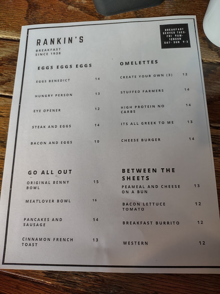 For lighter, healthier alternatives, Rankin's Grill offers oatmeal paired with coffee or tea, or a seasonal fruit plate that’s perfect for a fresh, energizing start. An English muffin with jam rounds out the lighter options, offering a simple yet tasty bite.